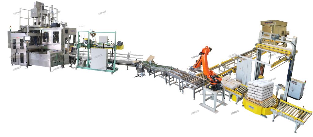 Bu xətt, 15-25 kq karft kağız torbaya yığılmış toz doldurma torbalarının avtomatik çəkilməsi və sonra torbanın möhürlənməsi üçün xüsusi dizayndır. Müştərinin tələbinə uyğun olaraq biz həmçinin avtomatik çəki yoxlaması, metal detektoru və paletləmə təklif edirik.