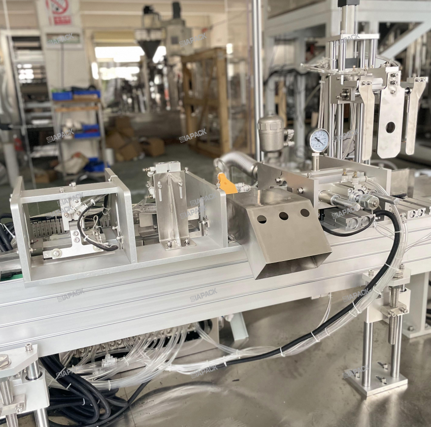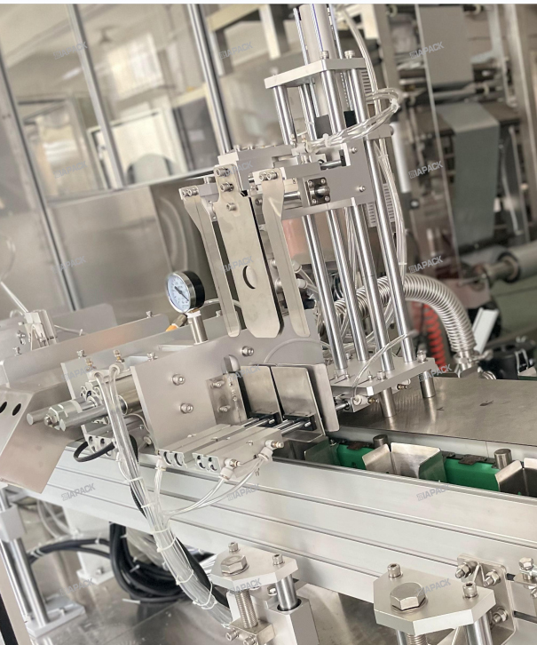 Bu maşın üst etiketli gusset çanta hazırlamaq üçün xüsusi dizayndır. Məhsulu bu maşına buraxan tam çantadan sonra. Bu maşın çantanı daşıyacaq, bir dəfə çantanın ağzını qatlayacaq və sonra etiketi yapışdıracaq. Maşın çərçivəsi tərəfindən hazırlanmışdır. SUS304 .PLC və sensor ekran Siemens markası tərəfindən qəbul edilir .Və Pnevmatik hissələr SMC markasını qəbul edir .Əsas Elektrik komponentləri Omron və Schneider markasını qəbul edir. Bu maşın bitmiş çantanın üst etiketinə çatmaq üçün avtomatik qablaşdırma maşını ilə işləyir .Bu maşın avtomatik olaraq funksiyaya çata bilər . etiketin ayrılması ,Etiket göndərilməsi .Etiket detektoru və etiketin basılması .