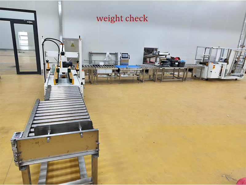 Kisələri dondurulmuş qida ilə doldurduqdan sonra çəkinin hədəf çəkiyə uyğun olub-olmadığını yoxlamaq üçün hər bir çanta çəki detektoru ilə yenidən yoxlanılır və sonra metal detektordan keçir ki, hər torbaya metal qarışmasın. Çantalar daha sonra karton doldurma xəttinə daşınır.