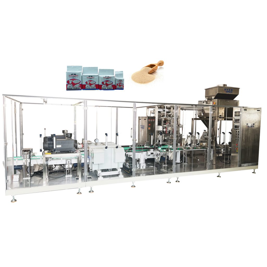 Quru mayanı qidalandırmaq üçün bir dəst ZK3 vakuum lifti, bir dəst ZL520 şaquli çanta qablaşdırma və möhürləmə maşını. bir dəst ZLC4-2000 dörd vedrə çəkmə maşını, Bir dəst ZL-100V2 İkiqat vakuum kameralı qablaşdırma maşını. Bu maşın qida aptek kimyəvi və digər məhsulları toz və ya kiçik qranula qablaşdırmaq üçün geniş istifadə olunur. Qəhvə tozu, maya tozu buğda unu və s. Vakuum dərəcəsi çox yüksəkdir və qablaşdırma sürəti çox yüksəkdir, 30 torba/dəq çata bilər .Hazır məhsulun uzun raf ömrü və gözəl forması var.